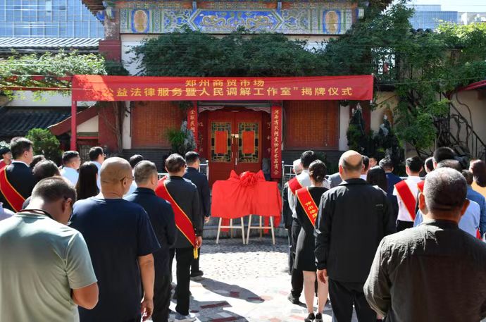 2025年9月25日上午,郑州市法律援助基金会联合郑州市市场发展中心共同打造的全国首个商贸市场“公益法律服务暨人民调解工作室”(以下简称工作室)在郑州古玩城正式揭牌成立。中国法律援助和司法行政英烈关爱救助基金会、河南省法律援助中心、郑州市司法局、郑州市市场发展中心、郑州市法律援助基金会、郑州市二七区人民政府、郑州市二七区司法局等相关单位领导及律师代表近50人出席了揭牌仪式,共同见证工作室成立。
